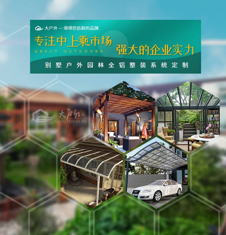 我司主要从事铝合金户外产品的研发、生产和销售,产品主要有铝合金阳光房、葡萄架、凉亭、花箱、雨棚、车棚等;